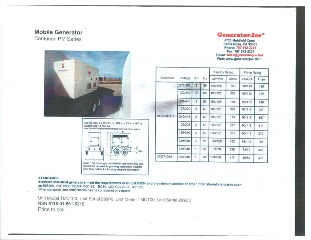 Serious buyers only—please contact me directly at joe@generatorjoe.net or call 707 542-2223 for immediate information, offers, or to discuss available inventory. Time is of the essence; all equipment must go.